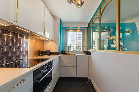 Cet appartement dispose d'une magnifique cuisine avec du carrelage au sol et tout l'équipement nécessaire pour votre quotidien : plaques de cuisson, réfrigerateur, congélateur, four, micro onde combiné, grille pain, cafetière, vaisselle, poubelle.