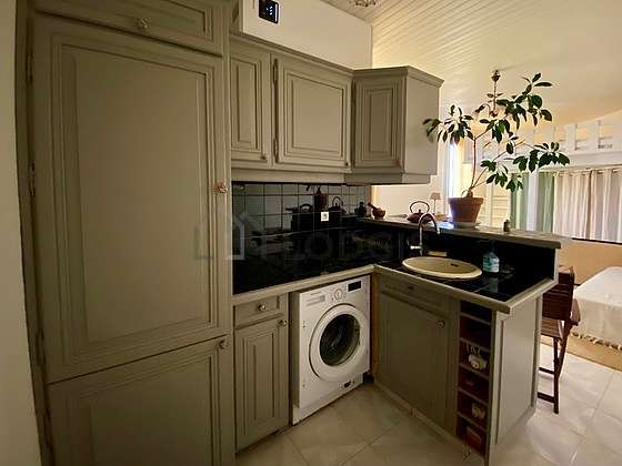 Cet appartement dispose d'une cuisine et tout l'équipement nécessaire pour votre quotidien : plaques de cuisson, réfrigerateur, congélateur, cafetière, vaisselle, lavabo, poubelle.