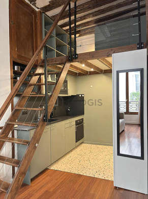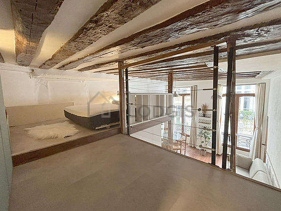 Grâce à une belle hauteur sous plafond, une mezzanine a pu être installée dans cet appartement , vous offrant ainsi une vraie pièce en plus équipée de télé, draps, couettes, penderie, etagère, commode, placard, table de chevet, console, miroir, tapis.