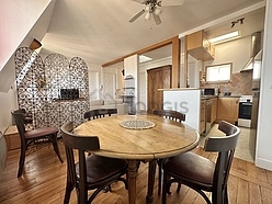 SéjourCet appartement est composé d'un plaisant salon avec du parquet au sol et des fenêtres. Ce salon calme est meublé et équipé pour rendre votre séjour agréable : télé, canapé, table à manger, table basse, placard, 5 chaise(s), meuble tv.