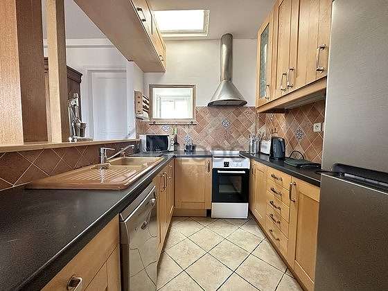 Cet appartement dispose d'une belle cuisine avec du carrelage au sol et tout l'équipement nécessaire pour votre quotidien : plaques de cuisson, réfrigerateur, congélateur, four, micro ondes, grille pain, bouilloire électrique, vaisselle, 1 chaise(s), bar, lavabo.
