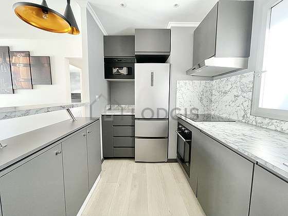 Cet appartement dispose d'une magnifique cuisine avec du carrelage au sol et tout l'équipement nécessaire pour votre quotidien : plaques de cuisson, réfrigerateur, four, micro ondes, freezer, hotte, grille pain, bouilloire électrique, cafetière, vaisselle.