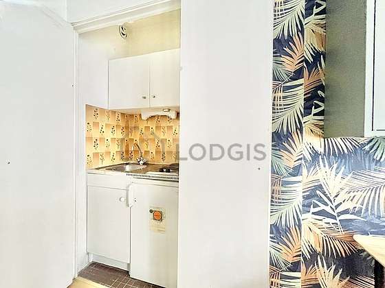 Cet appartement dispose d'une cuisine avec du carrelage au sol et tout l'équipement indispensable pour votre quotidien : plaques de cuisson, réfrigerateur, micro ondes, freezer, vaisselle.
