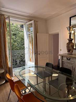 SéjourCet appartement est composé d'un salon avec du parquet au sol et des fenêtres double vitrage. Ce salon est meublé et équipé pour rendre votre séjour agréable : canapé, table à manger, table basse, etagère, buffet, 4 chaise(s), miroir, rideaux.