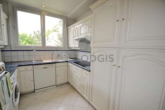 Cet appartement dispose d'une cuisine avec du carrelage au sol et tout l'équipement essentiel pour votre quotidien : plaques de cuisson, réfrigerateur, congélateur, freezer, hotte.