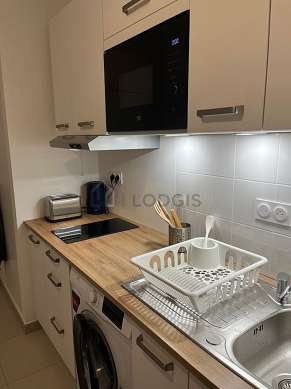 Cet appartement dispose d'une cuisine avec du carrelage au sol et tout l'équipement essentiel pour votre quotidien : plaques de cuisson, réfrigerateur, hotte, placard.