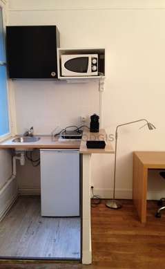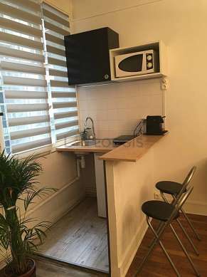Cet appartement dispose d'une cuisine et tout l'équipement essentiel pour votre quotidien : plaques de cuisson, réfrigerateur, four, micro ondes, table à manger, etagère, placard, vaisselle, 1 chaise(s), bar, lave main, poubelle, ventilateur.