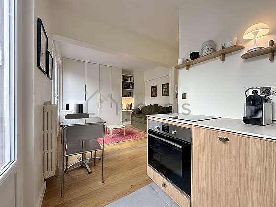 Cet appartement dispose d'une cuisine avec du carrelage au sol et tout l'équipement indispensable pour votre quotidien : plaques de cuisson, réfrigerateur, congélateur, four, micro ondes, freezer, cafetière.