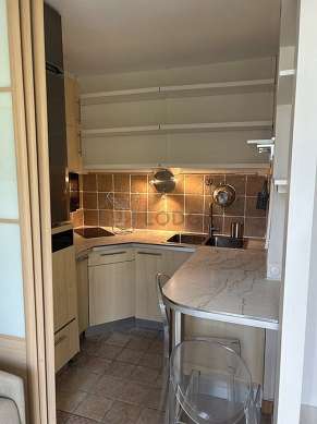 Cet appartement dispose d'une cuisine avec du carrelage au sol et tout l'équipement nécessaire pour votre quotidien : réfrigerateur, table à manger, placard, 1 chaise(s).