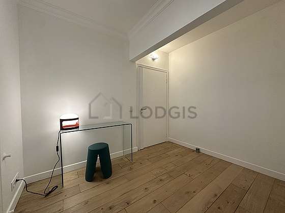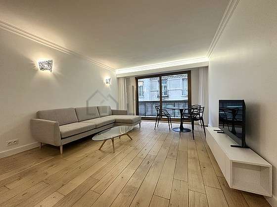 Cet appartement est composé d'un séduisant salon avec du parquet au sol vue sur rue. Ce salon calme est meublé et équipé pour rendre votre séjour agréable : télé, canapé, table à manger, table basse, 1 chaise(s), meuble tv.