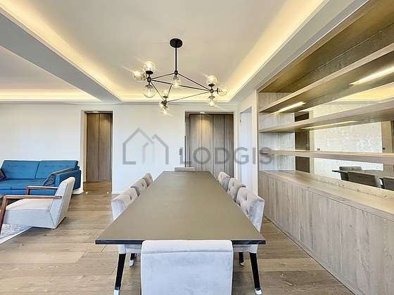 SéjourCet appartement est composé d'un salon avec du parquet au sol et des fenêtres double vitrage. Ce salon est meublé et équipé pour rendre votre séjour agréable : télé, canapé, 1 fauteuil(s), table à manger, table basse, 1 chaise(s), lampadaire sur pied, lustre, tapis.