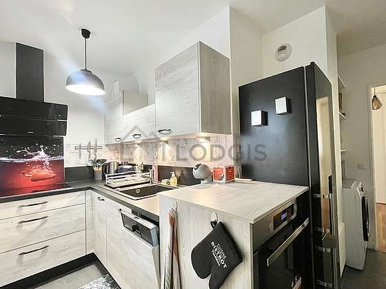 Cet appartement dispose d'une cuisine avec du carrelage au sol et tout l'équipement nécessaire pour votre quotidien : plaques de cuisson, réfrigerateur, four, micro ondes, freezer, grille pain, vaisselle, poubelle.