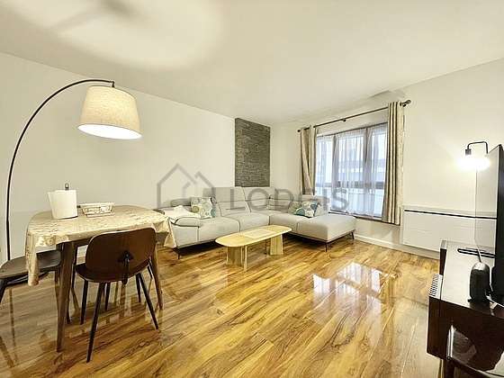 SéjourCet appartement est composé d'un salon avec du parquet au sol et des fenêtres. Ce salon est meublé et équipé pour rendre votre séjour agréable : télé, aspirateur, canapé, table à manger, commode, 1 chaise(s), meuble tv.