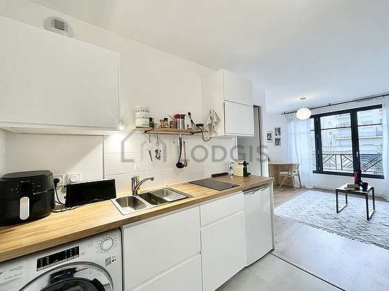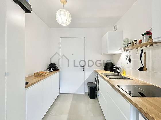 Cet appartement dispose d'une cuisine avec du carrelage au sol et tout l'équipement indispensable pour votre quotidien : plaques de cuisson, réfrigerateur, micro ondes, freezer, grille pain, bouilloire électrique, cafetière, armoire, vaisselle.