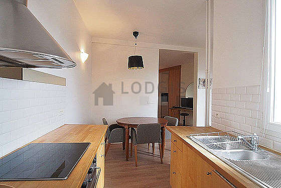 Cet appartement dispose d'une magnifique cuisine avec du parquet au sol et tout l'équipement nécessaire pour votre quotidien : plaques de cuisson, réfrigerateur, four, micro ondes, freezer, hotte, grille pain, bouilloire électrique, cafetière, table à manger, vaisselle, 3 chaise(s).