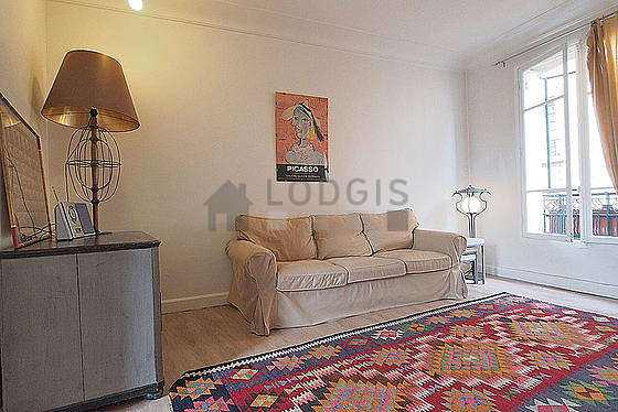Cet appartement est composé d'un superbe salon avec du parquet au sol et des fenêtres et vue sur cour. Ce salon très calme est meublé et équipé pour rendre votre séjour agréable : télé, canapé, 4 fauteuil(s), table basse, bureau, etagère, commode, 1 chaise(s), tabouret.