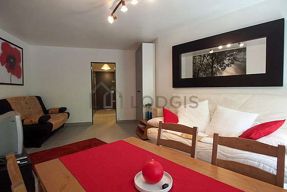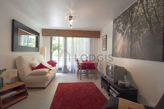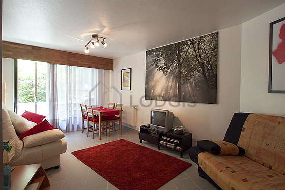 Cet appartement est composé d'un plaisant salon avec du carrelage au sol et des fenêtres double vitrage avec balcon et vue sur jardin. Ce salon calme est meublé et équipé pour rendre votre séjour agréable : télé, draps, couettes, table à manger, penderie, etagère, commode, placard, 4 chaise(s), table de chevet2 canapé(s) lit(s) de 120cm.