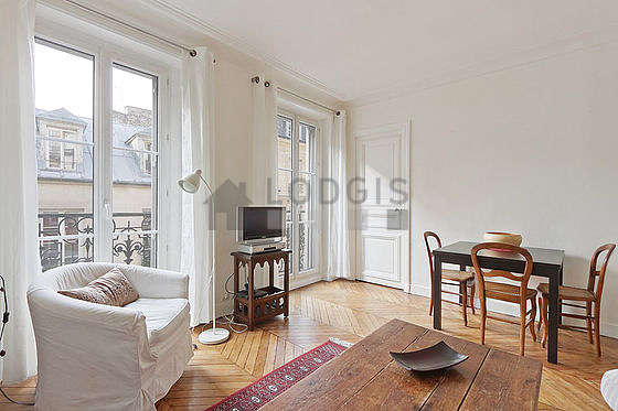 Cet appartement est composé d'un beau salon avec du parquet au sol et des fenêtres et vue sur rue. Ce salon calme est meublé et équipé pour rendre votre séjour agréable : télé, canapé, table à manger, table basse, 3 chaise(s), tabouret.