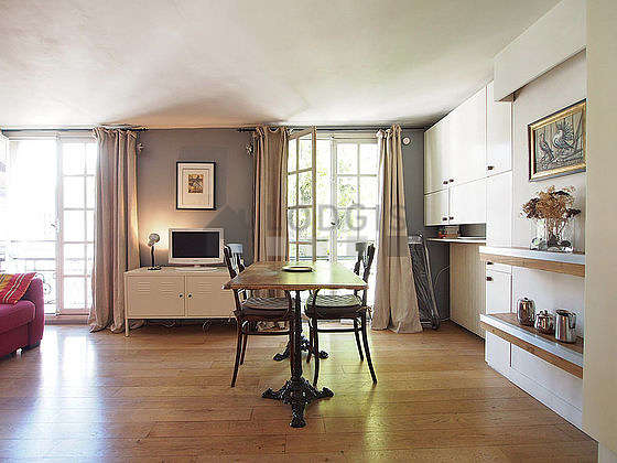 Cet appartement est composé d'un séduisant salon avec du parquet au sol et des fenêtres et vue sur cour. Ce salon calme est meublé et équipé pour rendre votre séjour agréable : télé, draps, table à manger, table basse, penderie, etagère, placard, 4 chaise(s)1 canapé(s) lit(s) de 160cm.