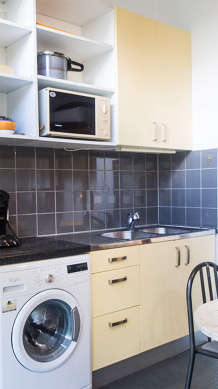 Cet appartement dispose d'une cuisine avec du parquet au sol et tout l'équipement indispensable pour votre quotidien : plaques de cuisson, réfrigerateur, congélateur, four, micro ondes, grille pain, cafetière, table à manger, vaisselle, 1 chaise(s).