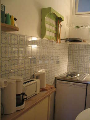 Cet appartement dispose d'une cuisine avec du carrelage au sol et tout l'équipement essentiel pour votre quotidien : plaques de cuisson, réfrigerateur, four, micro ondes, freezer, grille pain, cafetière, vaisselle.