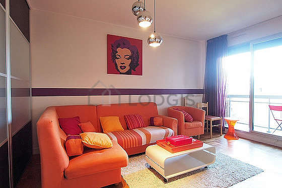Cet appartement est composé d'un charmant salon avec du parquet au sol et des fenêtres. Ce salon calme est meublé et équipé pour rendre votre séjour agréable : télé, canapé, 1 fauteuil(s), table basse, penderie, etagère, placard, 1 chaise(s).