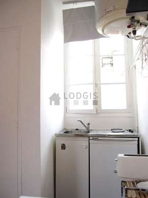 Cet appartement dispose d'une cuisine avec du parquet au sol et tout l'équipement indispensable pour votre quotidien : plaques de cuisson, réfrigerateur, freezer, grille pain, bouilloire électrique, etagère, placard, vaisselle.