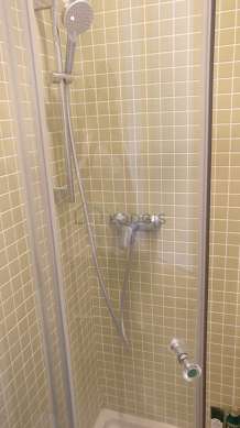 Cet appartement est équipé d'une salle de bain agréable et claire avec des fenêtres. Cette salle d'eau bénéficie du nécessaire pour votre bien-être au quotidien : serviettes de bain, etagère, placard, douche séparée, sèche cheveux. Les toilettes sont séparées de la salle de bain et situées dans une pièce indépendante.