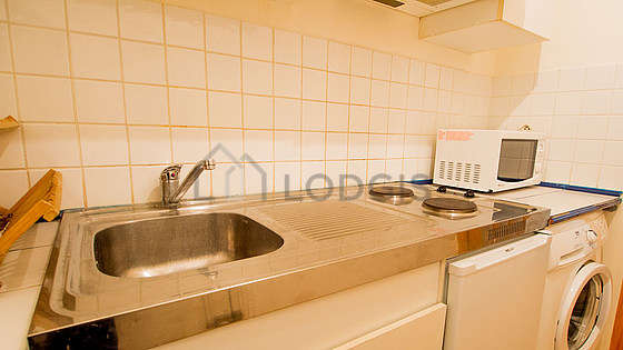 Cet appartement dispose d'une cuisine avec du parquet au sol et tout l'équipement indispensable pour votre quotidien : réfrigerateur, micro ondes, freezer, bouilloire électrique, cafetière, placard, vaisselle.