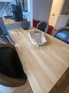 Cet appartement dispose d'une magnifique cuisine avec du linoleum au sol et tout l'équipement nécessaire pour votre quotidien : plaques de cuisson, réfrigerateur, four, micro ondes, grille pain, bouilloire électrique, cafetière, vaisselle, tabouret, bar.