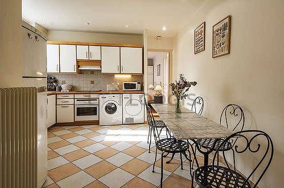 Cet appartement dispose d'une magnifique cuisine avec du carrelage au sol et tout l'équipement essentiel pour votre quotidien : plaques de cuisson, réfrigerateur, congélateur, four, micro ondes, hotte, grille pain, bouilloire électrique, cafetière, table à manger, placard, vaisselle, 6 chaise(s).
