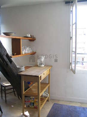 Cet appartement dispose d'une cuisine avec du linoleum au sol et tout l'équipement indispensable pour votre quotidien : plaques de cuisson, réfrigerateur, micro ondes, freezer, cafetière, vaisselle.