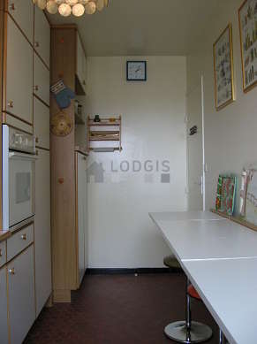 Cet appartement dispose d'une magnifique cuisine avec du carrelage au sol et tout l'équipement essentiel pour votre quotidien : plaques de cuisson, réfrigerateur, congélateur, four, micro ondes, grille pain, cafetière, placard, vaisselle, tabouret, bar.