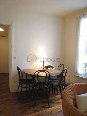 SéjourCet appartement est composé d'un salon avec du parquet au sol et des fenêtres double vitrage et vue sur cour. Ce salon très calme est meublé et équipé pour rendre votre séjour agréable : télé, canapé, 1 fauteuil(s), table à manger, table basse, placard, 4 chaise(s).