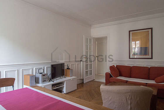 Cet appartement est composé d'un plaisant salon avec du parquet au sol et des fenêtres double vitrage et vue sur rue. Ce salon calme est meublé et équipé pour rendre votre séjour agréable : télé, canapé, 1 fauteuil(s), table à manger, table basse, etagère, cheminée, 4 chaise(s).