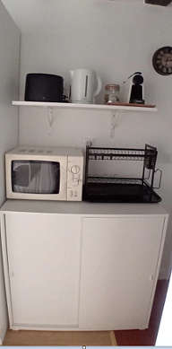 Cet appartement dispose d'une cuisine avec de la tomettes au sol et tout l'équipement essentiel pour votre quotidien : plaques de cuisson, réfrigerateur, micro ondes, freezer, hotte, grille pain, bouilloire électrique, cafetière, placard, vaisselle.