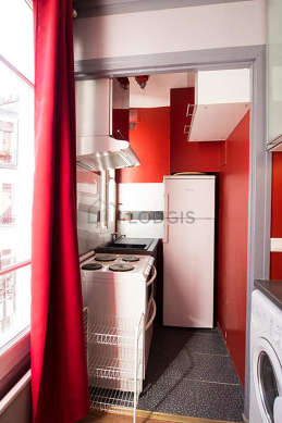 Cet appartement dispose d'une belle cuisine avec du carrelage au sol et tout l'équipement nécessaire pour votre quotidien : plaques de cuisson, réfrigerateur, congélateur, four, micro ondes, hotte, grille pain, bouilloire électrique, cafetière, placard, vaisselle, tabouret, bar.