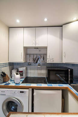 Cet appartement dispose d'une belle cuisine avec du carrelage au sol et tout l'équipement essentiel pour votre quotidien : plaques de cuisson, réfrigerateur, micro onde combiné, freezer, grille pain, bouilloire électrique, cafetière, placard, vaisselle, tabouret, bar.
