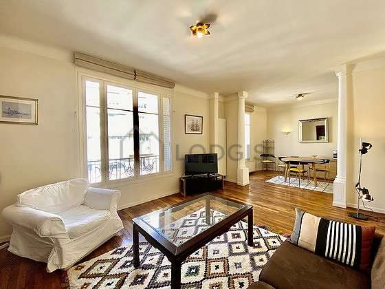 SéjourCet appartement est composé d'un superbe salon avec du parquet au sol et des fenêtres et vue sur rue. Ce salon calme est meublé et équipé pour rendre votre séjour agréable : télé, canapé, 1 fauteuil(s), table à manger, table basse, etagère, armoire, placard, 4 chaise(s).