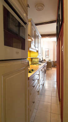 Cet appartement dispose d'une belle cuisine avec du carrelage au sol et tout l'équipement indispensable pour votre quotidien : plaques de cuisson, réfrigerateur, four, micro ondes, freezer, hotte, bouilloire électrique, cafetière, placard, vaisselle.