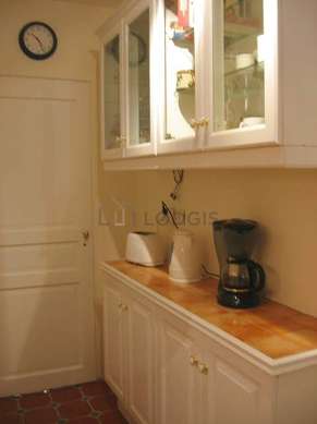 Cet appartement dispose d'une magnifique cuisine avec du carrelage au sol et tout l'équipement indispensable pour votre quotidien : plaques de cuisson, réfrigerateur, congélateur, four, micro ondes, grille pain, bouilloire électrique, cafetière, placard, vaisselle, robot ménager, tabouret.