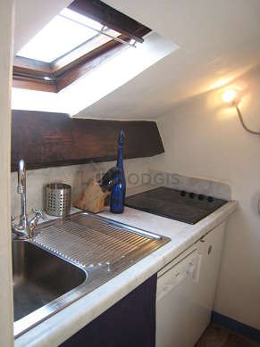 Cet appartement dispose d'une cuisine avec du carrelage au sol et tout l'équipement nécessaire pour votre quotidien : plaques de cuisson, réfrigerateur, congélateur, micro ondes, bouilloire électrique, placard, vaisselle.