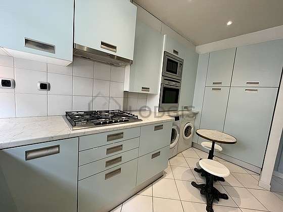 Cet appartement dispose d'une magnifique cuisine avec du carrelage au sol et tout l'équipement nécessaire pour votre quotidien : plaques de cuisson, réfrigerateur, congélateur, four, micro ondes, hotte, grille pain, bouilloire électrique, cafetière, table à manger, etagère, placard, vaisselle, tabouret.