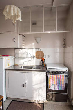 Cet appartement dispose d'une cuisine avec du carrelage au sol et tout l'équipement essentiel pour votre quotidien : plaques de cuisson, réfrigerateur, congélateur, four, micro ondes, cafetière, table à manger, placard, vaisselle, 1 chaise(s), tabouret.