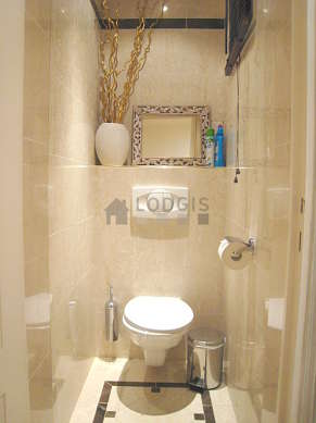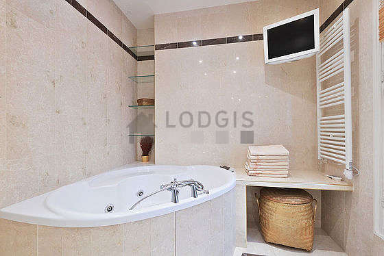 Cet appartement est équipé d'une salle de bain magnifique avec des fenêtres double vitrage. Cette salle d'eau bénéficie du nécessaire pour votre bien-être au quotidien : serviettes de bain, etagère, baignoire balnéothérapie, sèche cheveux, douche balnéo, radiateur sèche-serviettes. Les toilettes sont séparées de la salle de bain et situées dans une pièce indépendante.