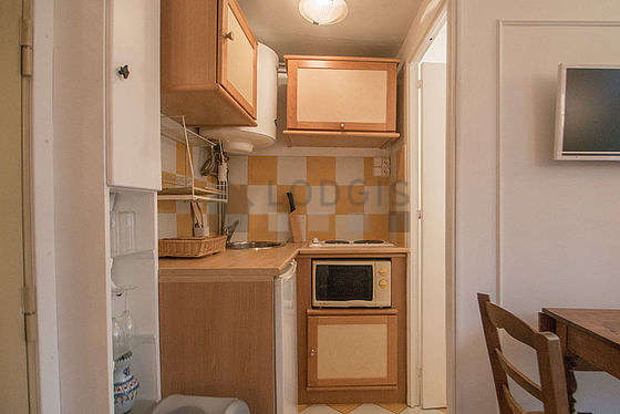 Cet appartement dispose d'une belle cuisine avec du carrelage au sol et tout l'équipement essentiel pour votre quotidien : plaques de cuisson, réfrigerateur, micro ondes, cafetière, placard, vaisselle.