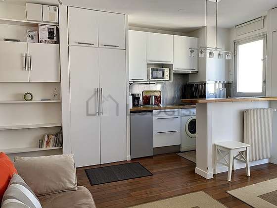 Cet appartement dispose d'une magnifique cuisine avec du parquet au sol et tout l'équipement indispensable pour votre quotidien : plaques de cuisson, réfrigerateur, micro onde combiné, freezer, hotte, grille pain, bouilloire électrique, cafetière, placard, vaisselle, bar.