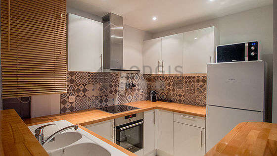 Cet appartement dispose d'une belle cuisine avec du carrelage au sol et tout l'équipement indispensable pour votre quotidien : plaques de cuisson, réfrigerateur, congélateur, micro onde combiné, hotte, placard, vaisselle, tabouret, bar.