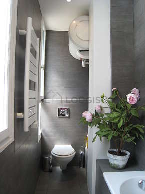Cet appartement est équipé d'une salle de bain agréable et claire avec des fenêtres double vitrage. Cette salle d'eau bénéficie du nécessaire pour votre bien-être au quotidien : serviettes de bain, placard, baignoire, sèche cheveux, radiateur sèche-serviettes. Les toilettes sont intégrées dans la salle de bain.