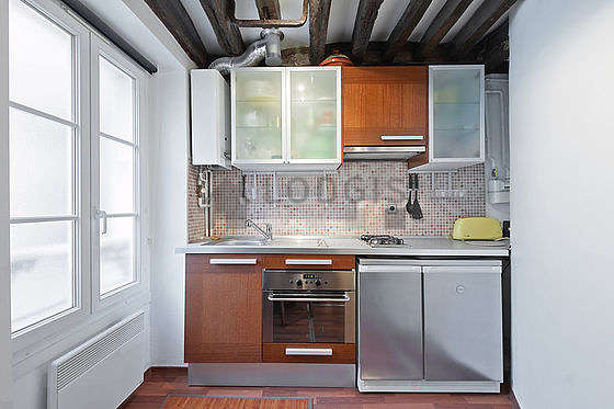 Cet appartement dispose d'une belle cuisine avec du parquet au sol et tout l'équipement essentiel pour votre quotidien : plaques de cuisson, réfrigerateur, congélateur, micro onde combiné, hotte, grille pain, bouilloire électrique, placard, vaisselle.